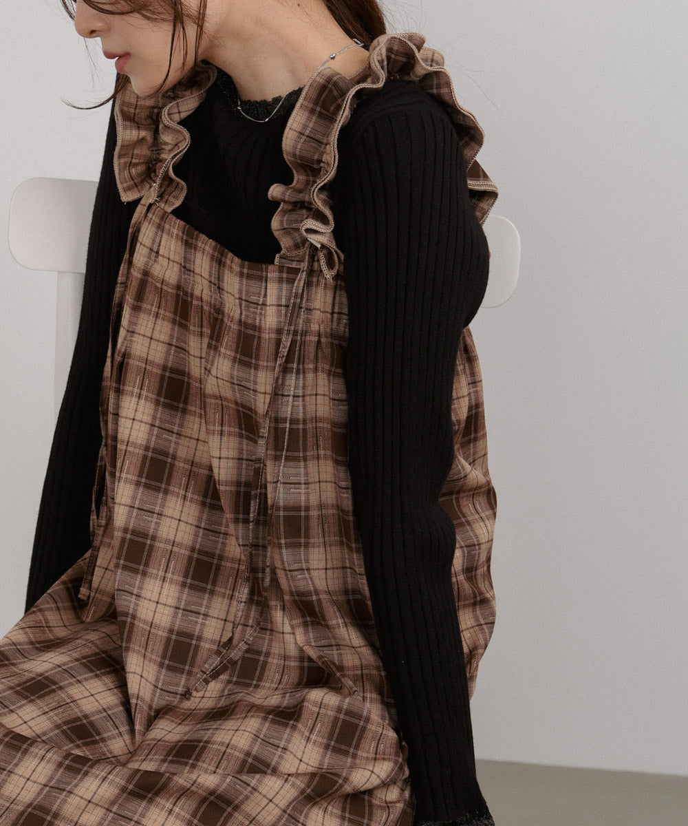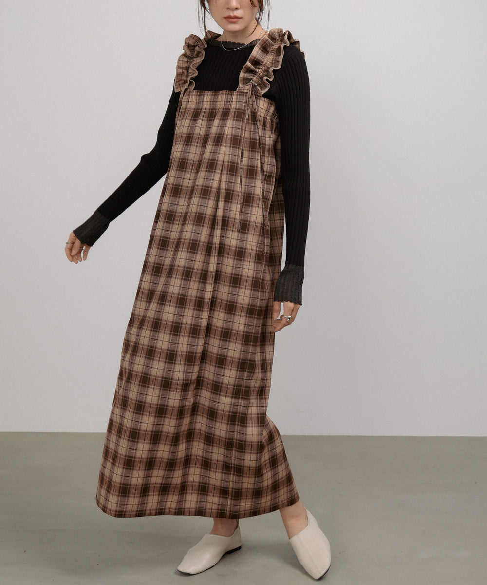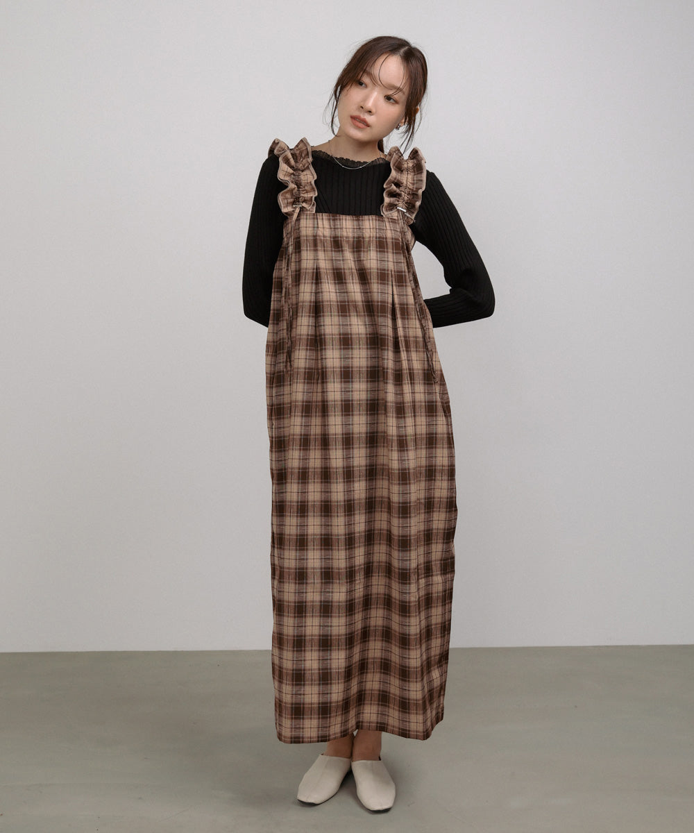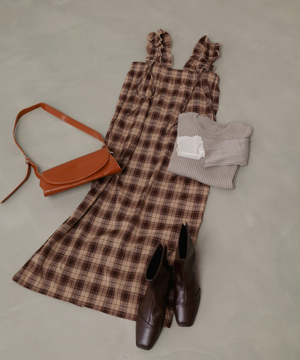 <限量現貨> 木耳邊粗肩束帶格紋OPS - brown