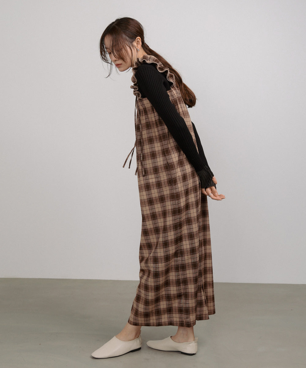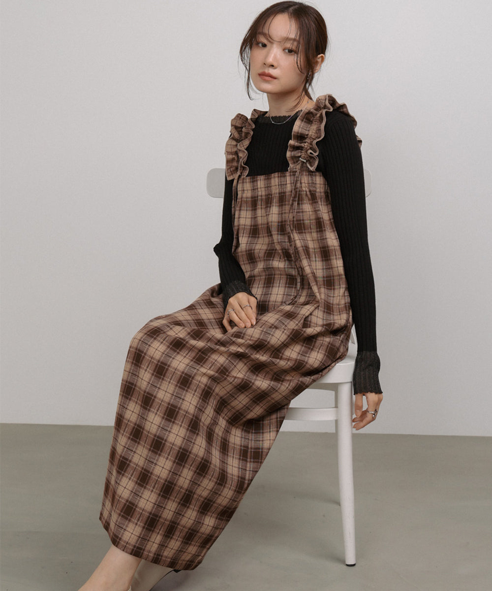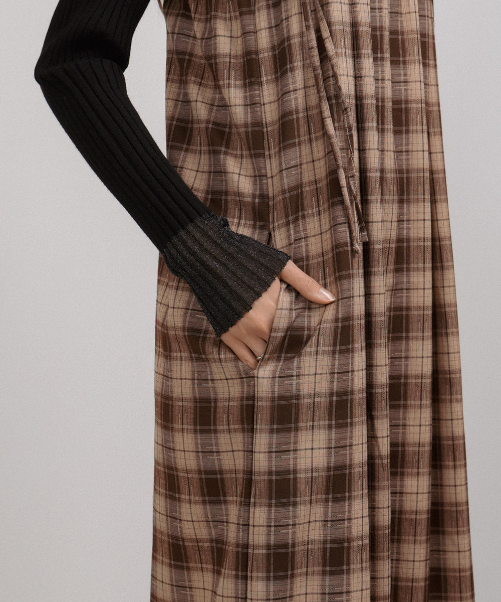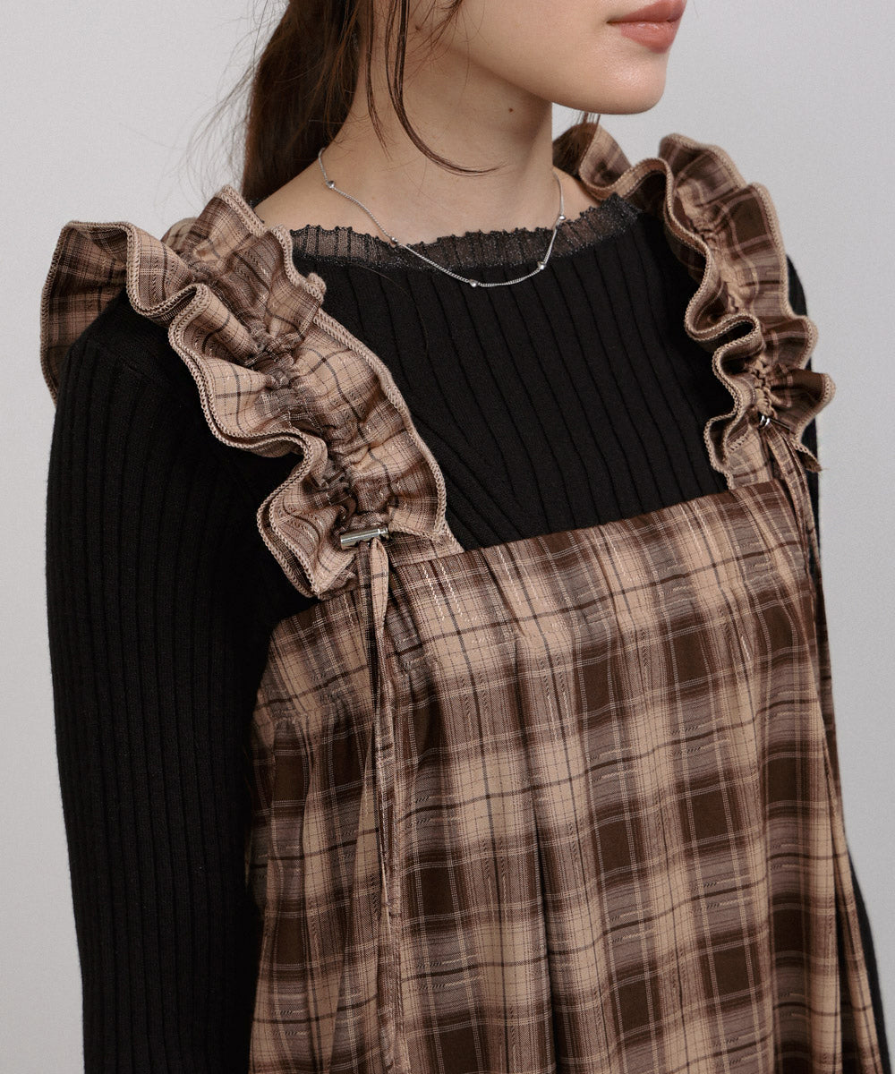 <限量現貨> 木耳邊粗肩束帶格紋OPS - brown