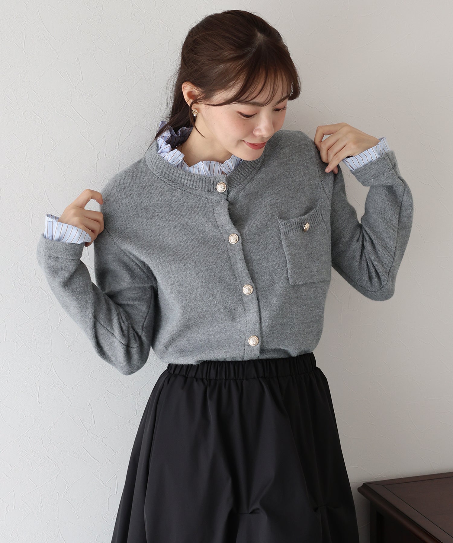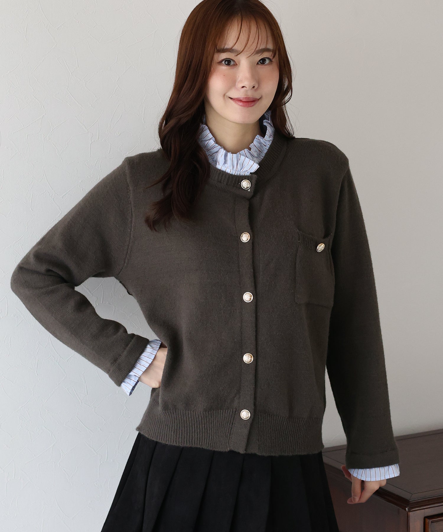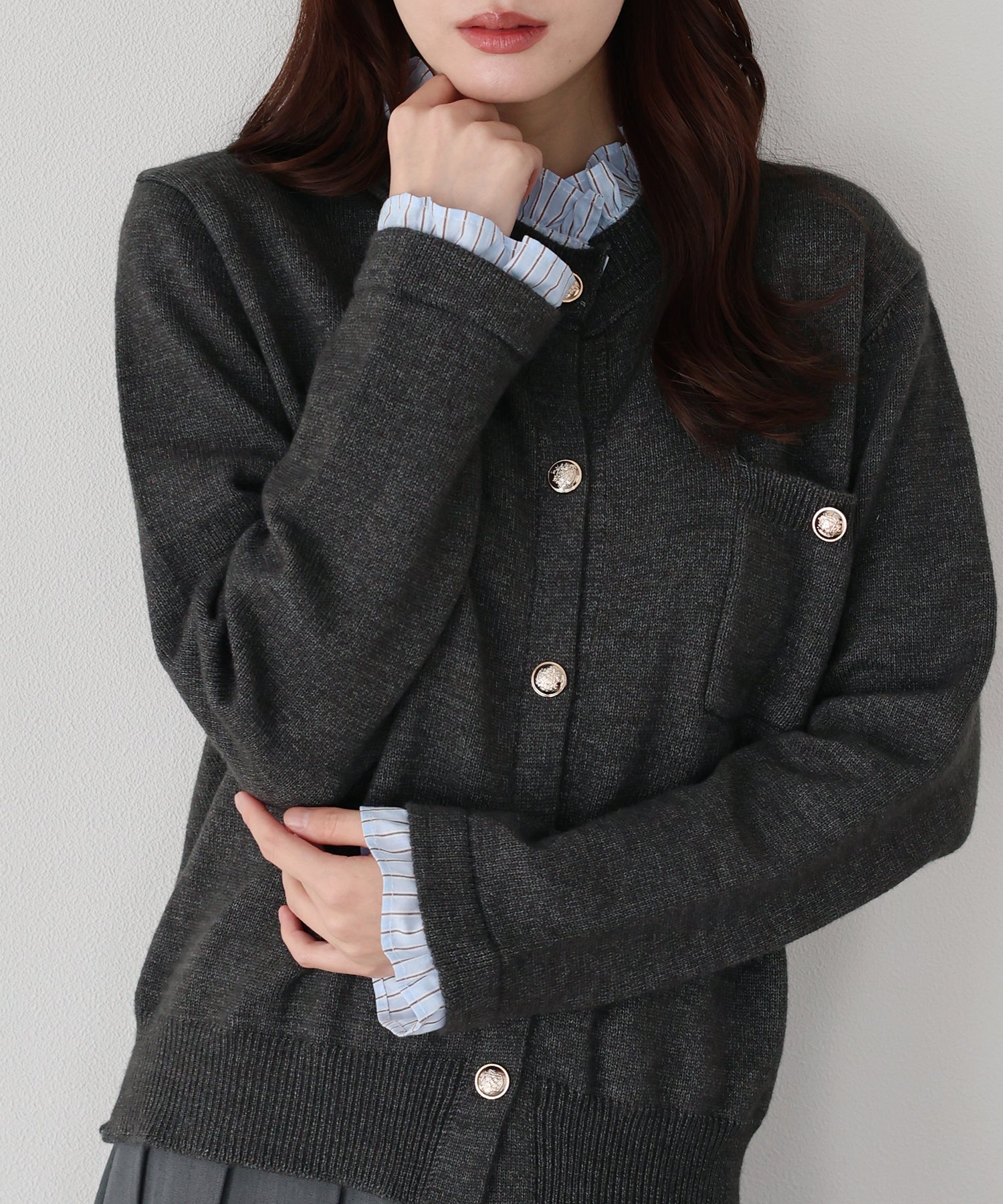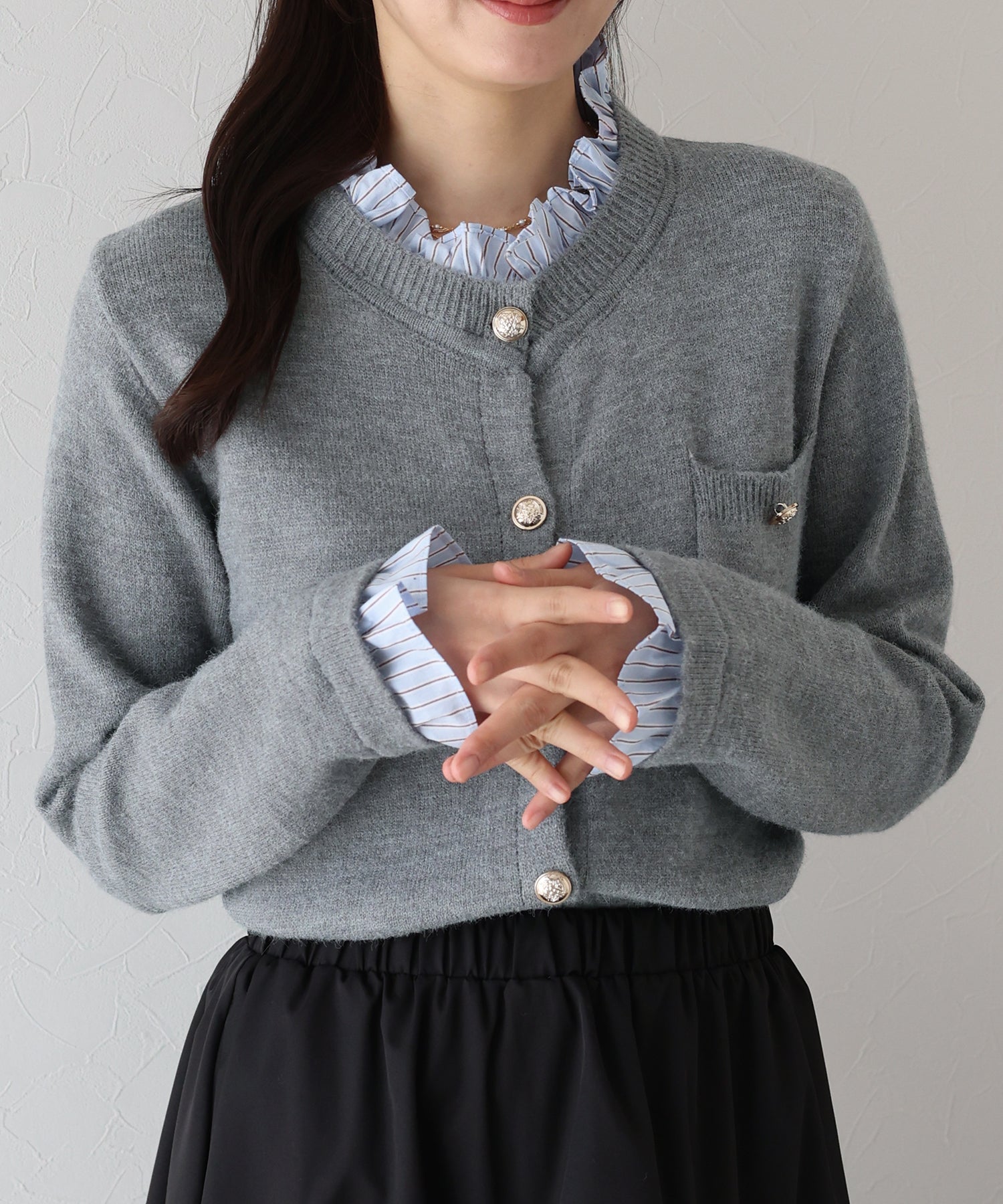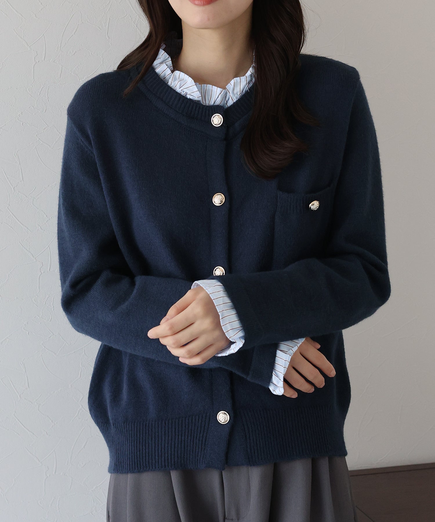 <日本團訂>預購一般於本團截單日起計約3-4週抵港♡ 請到 IG 查看本團截單日♡ 一件過就有搭配了兩件的效果 .ᐟ.ᐟ ⑅◡̈* 巧紗地穿出層次感~ ● 內層似是條紋裇衫 ● 領口與袖口均有條紋褶邊details ● 精緻的立體金鈕扣 ● 突顯了優雅簡潔的氣質 ● 上班式重要場合都好適合 ● 觸感柔軟舒適 𝖲𝗂𝗓𝖾 𝖽𝖾𝗍𝖺𝗂𝗅𝗌. 𝖲𝗁𝗈𝗎𝗅𝖽𝖾𝗋: 43.5𝖼𝗆 𝖢𝗁𝖾𝗌𝗍 𝗐𝗂𝖽𝗍𝗁: 55𝖼𝗆 𝖲𝗅𝖾𝖾𝗏𝖾: 59.5𝖼𝗆 𝖫𝖾𝗇𝗀𝗍𝗁: 61𝖼𝗆 Model’s tall: 167𝖼𝗆 Fabric. 42% acrylic, 30% polyester, 28% nylon 柔軟針織材質